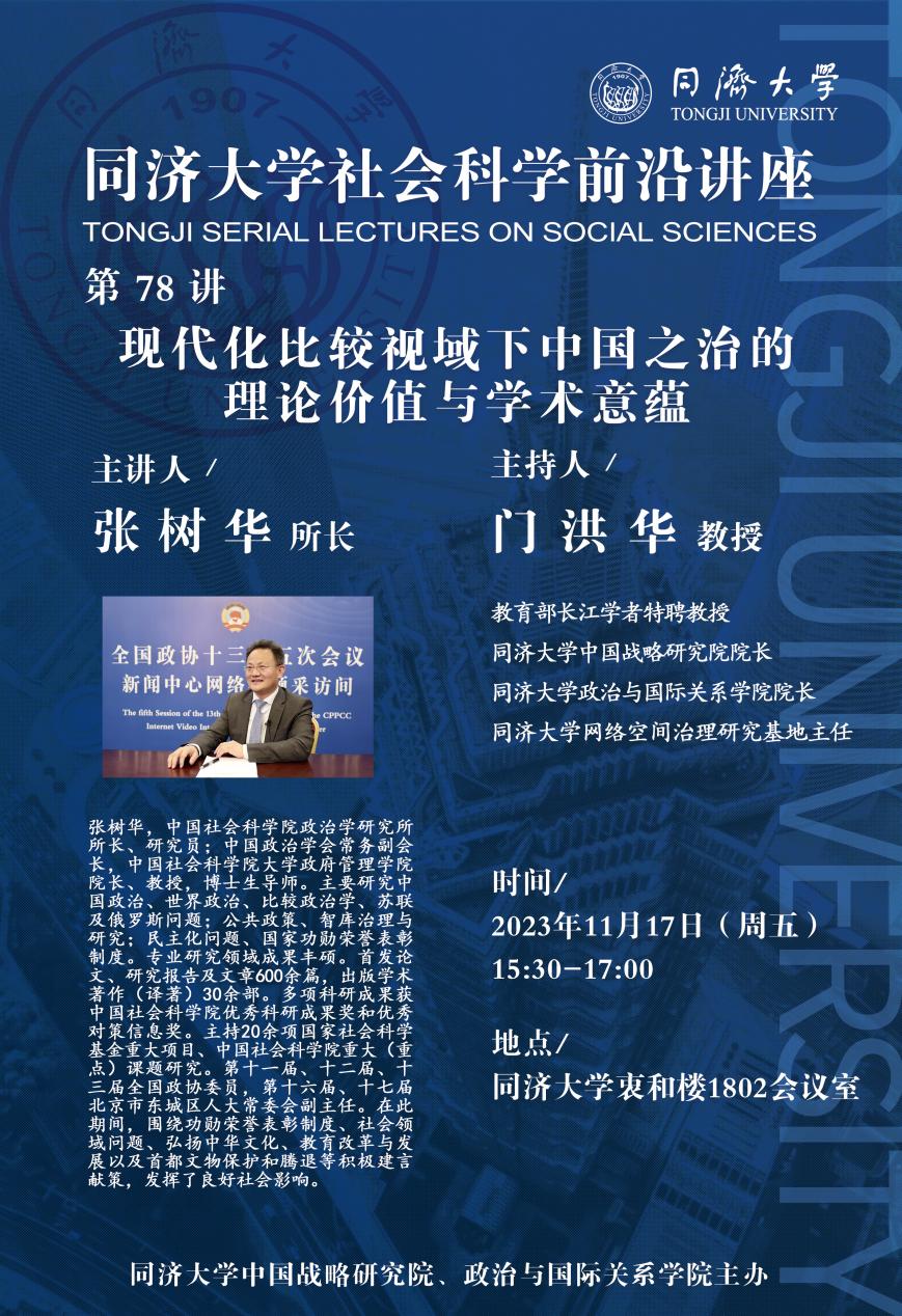 2023年11月17日,由同济大学中国战略研究院/政治与国际关系学院主办的同济大学社会科学前沿讲座第78讲在同济大学衷和楼1802会议室成功举办。本次讲座邀请中国社会科学院政治学研究所所长,中国政治学会常务副会长,中国社会科学院大学政府管理学院院长张树华研究员作题为“现代化比较视域下中国之治的理论价值与学术意蕴”的主题演讲。本次讲座由教育部长江学者特聘教授门洪华院长主持,CQ9(电子中国)官方网站党委书记蔡三发教授、中国社会科学院大学郑建君研究员、李熠助理研究员以及CQ9(电子中国)官方网站教师、博士生、硕士生50余人参加此次讲座。
