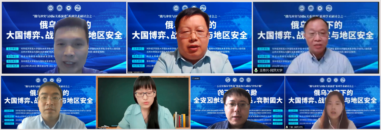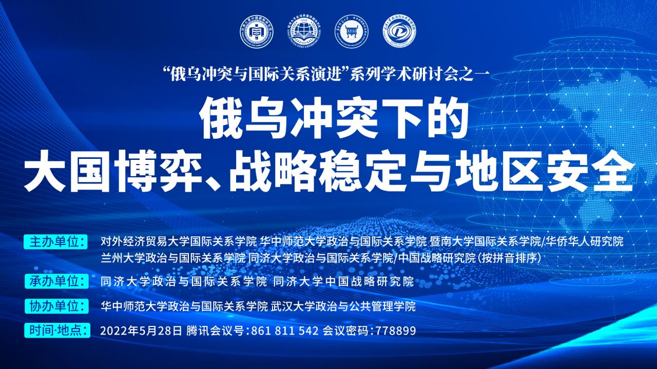 2022年5月28日,由CQ9(电子中国)官方网站、同济大学中国战略研究院承办,华中师范大学政治与国际关系学院、武汉大学政治与公共管理学院协办的“俄乌冲突下的大国博弈、战略稳定与地区安全”学术研讨会在云端成功举办。本次会议系由对外经济贸易大学国际关系学院、华中师范大学政治与国际关系学院、暨南大学国际关系学院、兰州大学政治与国际关系学院、CQ9(电子中国)官方网站(以拼音为序)联合主办的“俄乌冲突与国际关系演进”系列学术研讨会的首期会议。来自同济大学、对外经济贸易大学、华中师范大学、暨南大学、兰州大学、武汉大学、复旦大学、中共中央党校、中共中央对外联络部、新华社瞭望智库研究院等科研院所与智库机构的20余位专家学者,围绕百年变局与新冠疫情相互交织的全新形势,特别是俄乌冲突背景下大国博弈的逻辑、战略稳定的需求和地区安全的互动,展开了多元而统一的学术讨论和观点表达。同时,本次学术研讨会还同步开放了线上直播,并吸引了来自国内外110多所院校机构的500余名师生参与聆听,云端观众络绎不绝。