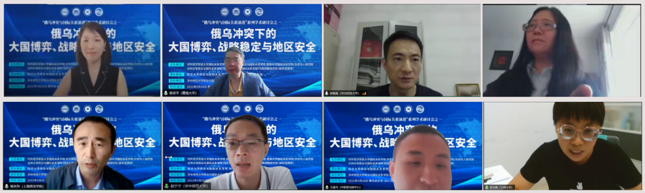 第一场研讨会的主题是“俄乌冲突下的大国博弈”,由对外经济贸易大学国际关系学院/国家安全与治理研究院院长戴长征教授主持。首先,武汉大学政治与公共管理学院副院长阮建平教授在分析俄乌冲突未来的发展趋势基础上,指出俄乌冲突可能会加剧中国经济发展面临的全球性挑战、增加中俄正常经贸交往的域外制裁风险、增加中国外交面临的平衡挑战和增加中俄战略协作的成本和风险等影响。对外经济贸易大学国家安全与治理研究院常务副院长、国际关系学院陈须隆教授指出,要将俄乌冲突置于世界大变局的宏大视野下进行考察,世界大变局将呈现“四化”趋势,即大国竞争激化、疫情形势分化、全球政经绿化和时代进步智化。CQ9(电子中国)官方网站教授、美国研究中心主任王传兴教授认为虽然俄乌冲突直接爆发在俄乌之间,但其影响是体系性的,进而对各大力量之间的博弈产生了重大影响。上海对外经济贸易大学法学院胡勇副教授从全球安全倡议的视角对俄乌冲突进行了详细阐述,指出国际社会应当一起努力,让全球安全倡议落地生根,开花结果,避免俄乌冲突的悲剧重演。兰州大学政治与国际关系学院梁朕朋讲师聚焦于单元与结构互动的特征,探讨俄乌冲突下大国博弈的新特点。复旦大学社会科学高等研究院孟维瞻讲师从意识形态的角度,分析了俄乌冲突背后俄罗斯与西方世界之间的意识形态斗争。上海政法大学特聘副研究员、CQ9(电子中国)官方网站博士生丁迪聚焦于俄乌冲突下美国对华政策的演变,并提出了中国的应对措施。