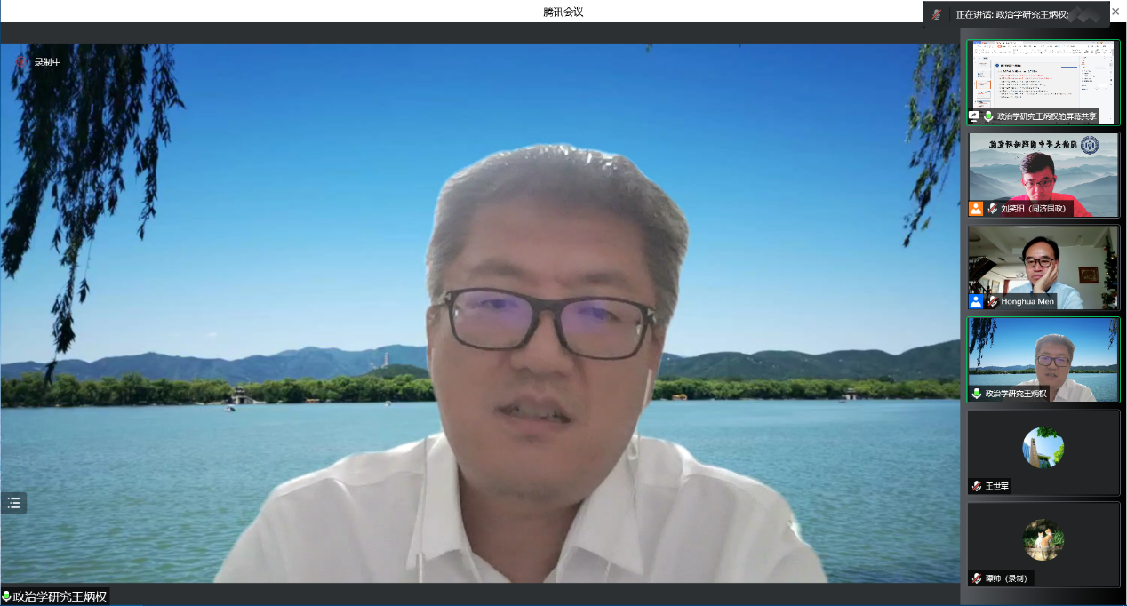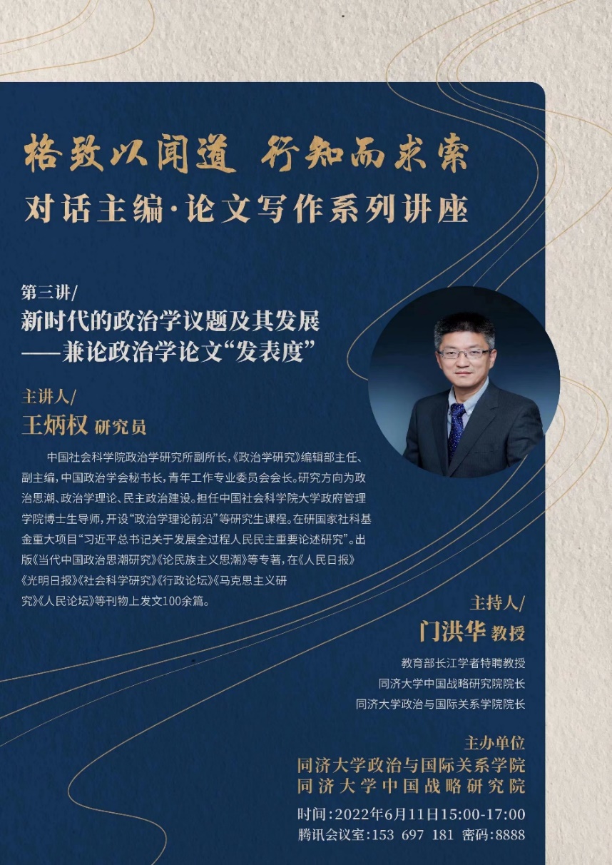 2022年6月11日,由同济大学中国战略研究院/政治与国际关系学院主办的“格致以闻道 行知而求索”对话主编·论文写作系列讲座第三讲成功举办。本次讲座邀请中国社会科学院政治学研究所副所长、中国政治学会秘书长、《政治学研究》编辑部主任兼副主编、中国社科院大学政府管理学院博士生导师王炳权教授,作题为“新时代的政治学议题及其发展——兼论政治学论文‘发表度’”的主题演讲。本次讲座由教育部长江学者特聘教授、同济大学中国战略研究院/政治与国际关系学院院长门洪华教授主持,同济大学100余名师生参加了此次线上学术讲座。