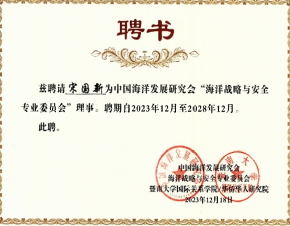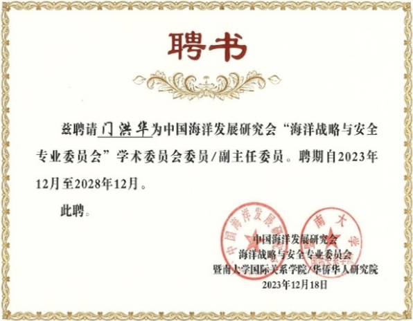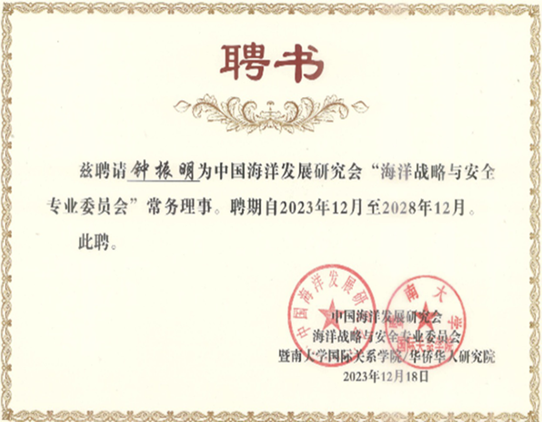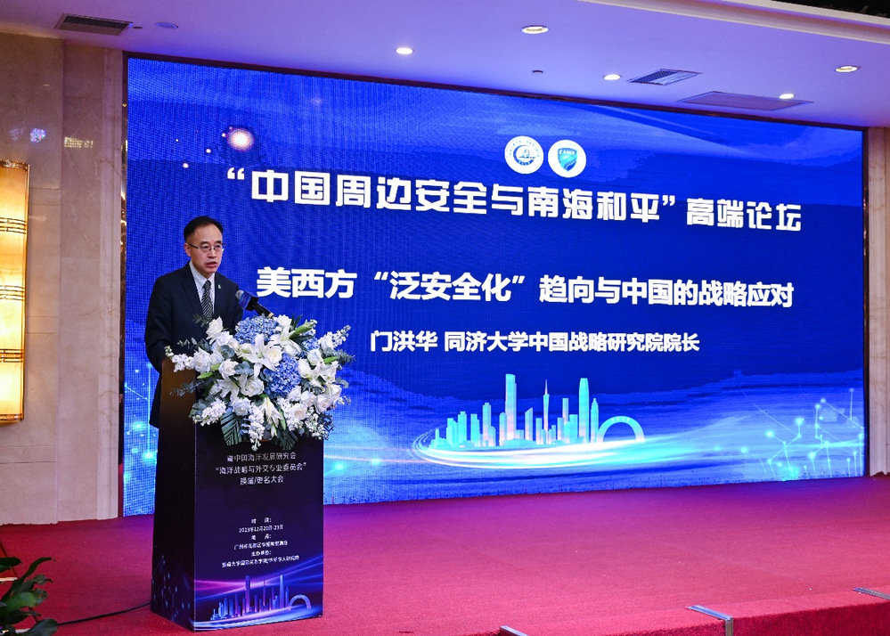 2023年12月20-21日,中国海洋发展研究会海洋战略与安全专业委员会换届大会暨“中国周边安全与南海和平”高端论坛在广州举行,会议由中国海洋发展研究会海洋战略与安全专业委员会、暨南大学国际关系学院/华侨华人研究院联合主办。来自全国各地高校和研究单位的专家代表100多人参加会议,同济大学中国战略研究院/政治与国际关系学院门洪华院长出席,学院副院长钟振明教授和博士后宋国新等参加了论坛会议交流。