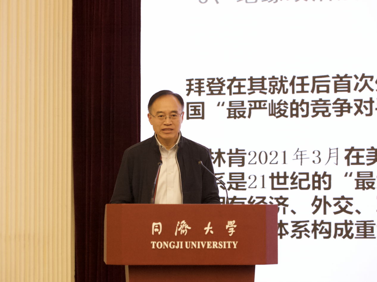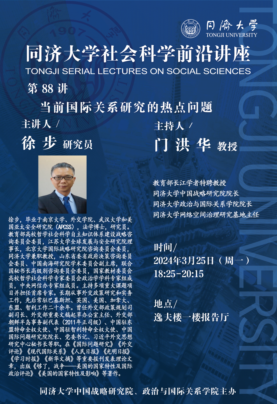 2024年3月25日,由同济大学中国战略研究院/政治与国际关系学院主办的同济大学2024年度校级高等讲堂第68讲、同济大学社会科学前沿讲座第88讲在同济大学逸夫楼一楼报告厅成功举办。本次讲座邀请中国国际问题研究院原党委书记兼院长、习近平外交思想研究中心前秘书长、中国外交部朝鲜半岛事务原副代表、中国原驻东盟使团团长兼大使、中国原驻智利大使徐步作题为“当前国际关系研究的热点问题”的主题演讲。本次讲座由教育部长江学者特聘教授门洪华院长主持,同济大学教师、博士生、硕士生300余人参加了此次讲座。