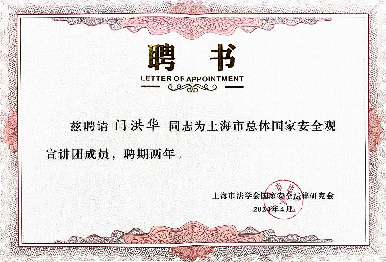 2024年4月,教育部长江学者特聘教授、同济大学中国战略研究院/政治与国际关系学院院长、教育部哲学社会科学重大课题攻关项目“国家安全战略研究”首席专家门洪华教授受聘为上海市总体国家安全观宣讲团成员。