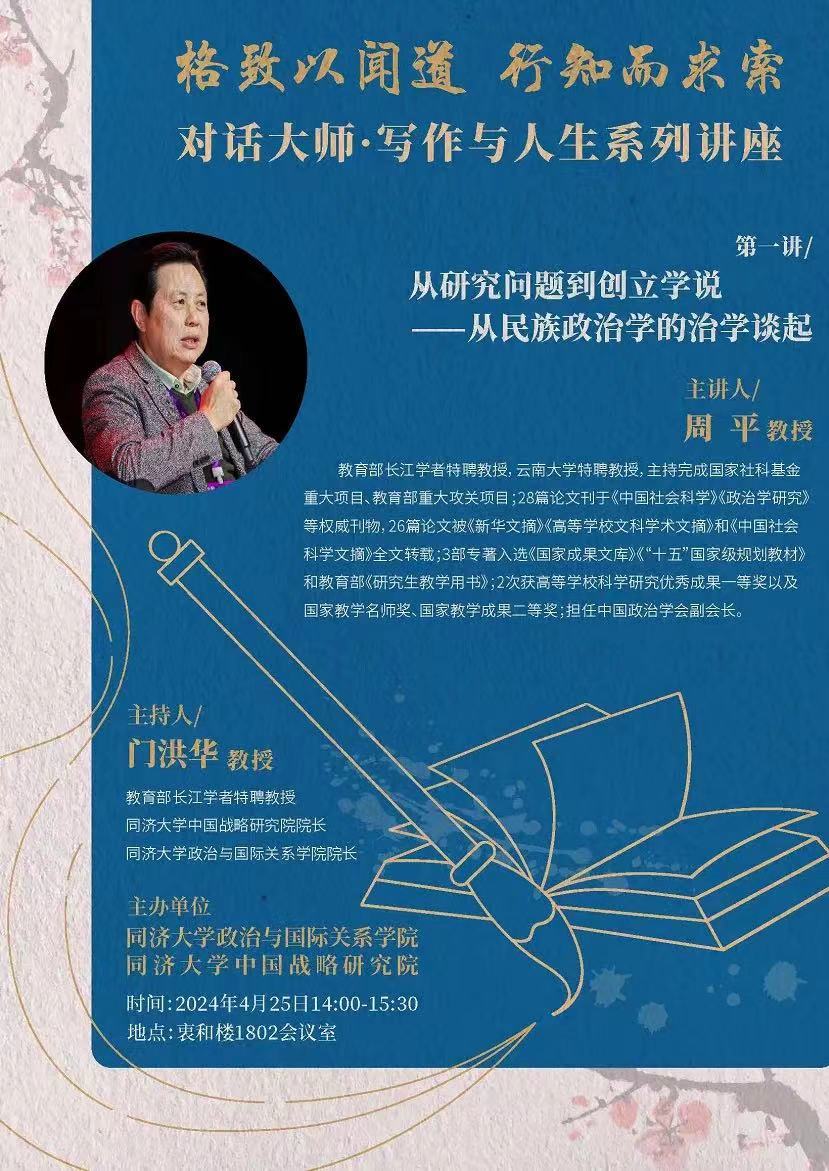 2024年4月25日,由同济大学中国战略研究院/政治与国际关系学院主办的对话大师·写作人生系列讲座第一讲在同济大学衷和楼1802会议室成功举办。本次讲座邀请教育部长江学者特聘教授、云南大学特聘教授、中国政治学学会副会长周平教授作题为“从研究问题到创立学说——从民族政治学谈起”的主题演讲。本次讲座由教育部长江学者特聘教授门洪华院长主持,同济大学政治与国际关系学院教师、博士生、硕士生50余人参加此次讲座。