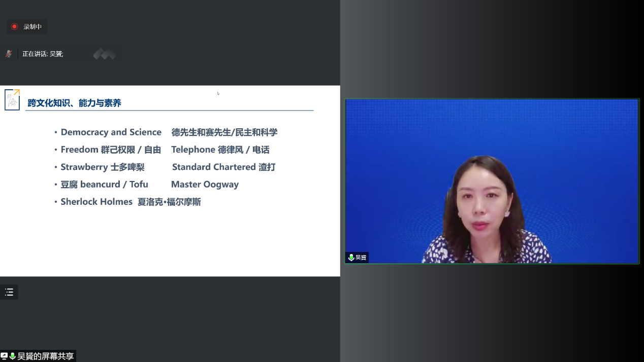 第四场名家课堂由教育部“青年长江学者”、同济大学外国语学院院长吴赟教授主讲。吴赟教授以“做中国文化的传播者”为题,梳理外语在国家发展进程中的角色及其历史变迁,分享关于提升中国国际传播能力的现实思考,探讨外语学科发展的时代语境和学科使命,强调了跨文化知识、能力和素养对于表达和传播中国文化理念的重要性,勉励年轻学子通过语言叙事为中国正名并且成为多元文化的传播者。