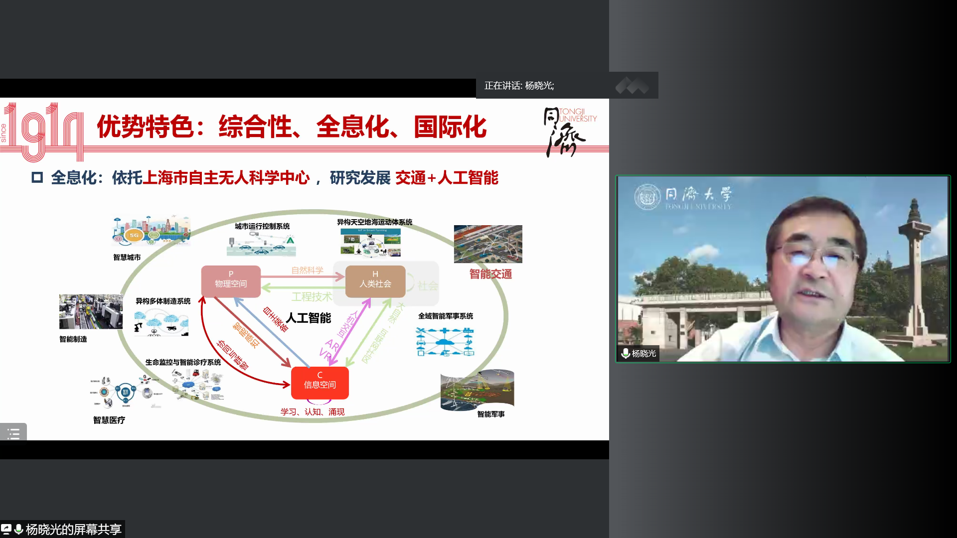 第六场名家课堂由同济大学长聘教授/二级教授杨晓光教授主讲。杨晓光教授以“新工业革命与智慧交通”为题,分别介绍交通发展和同济交通学科的发展,回顾交通在人类历史和现代社会发展过程中的重要作用,梳理现代交通系统的组成,讲解交通发展的挑战与与时俱进的不断创新,强调交通运输是强国之先导,介绍了交通学科与专业的整体情况,分享了同济大学交通学科的特色、成就与目标。
