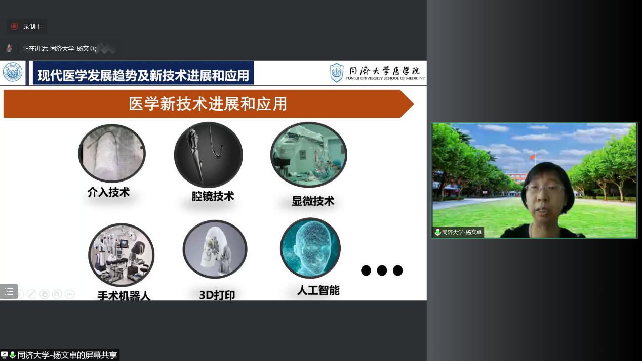 第五场名家课堂由同济大学医学院副院长杨文卓教授主讲。杨文卓教授以“现代医学技术进展与医学人才培养”为题,讲解医学相关概念及医学模式转变、探讨现代医学发展趋势,介绍了腔镜、显微技术、辅助机器人、3D打印技术等医学新技术的进展与运用,提出在半数以上的现代科学前沿问题都与医学相关,指出医学和人工智能等其他学科的结合是未来发展的趋势,讲解了现代医学人才培养体系。