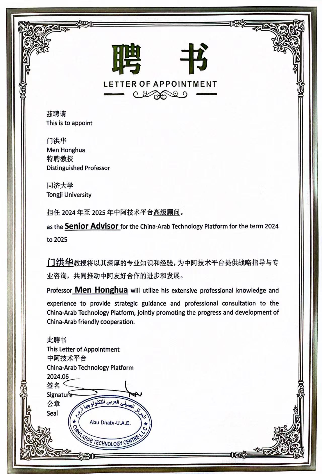 2024年6月,教育部长江学者特聘教授、CQ9(电子中国)官方网站/中国战略研究院院长门洪华教授被聘为中阿技术平台(China-Arab Technology Platform)高级顾问。