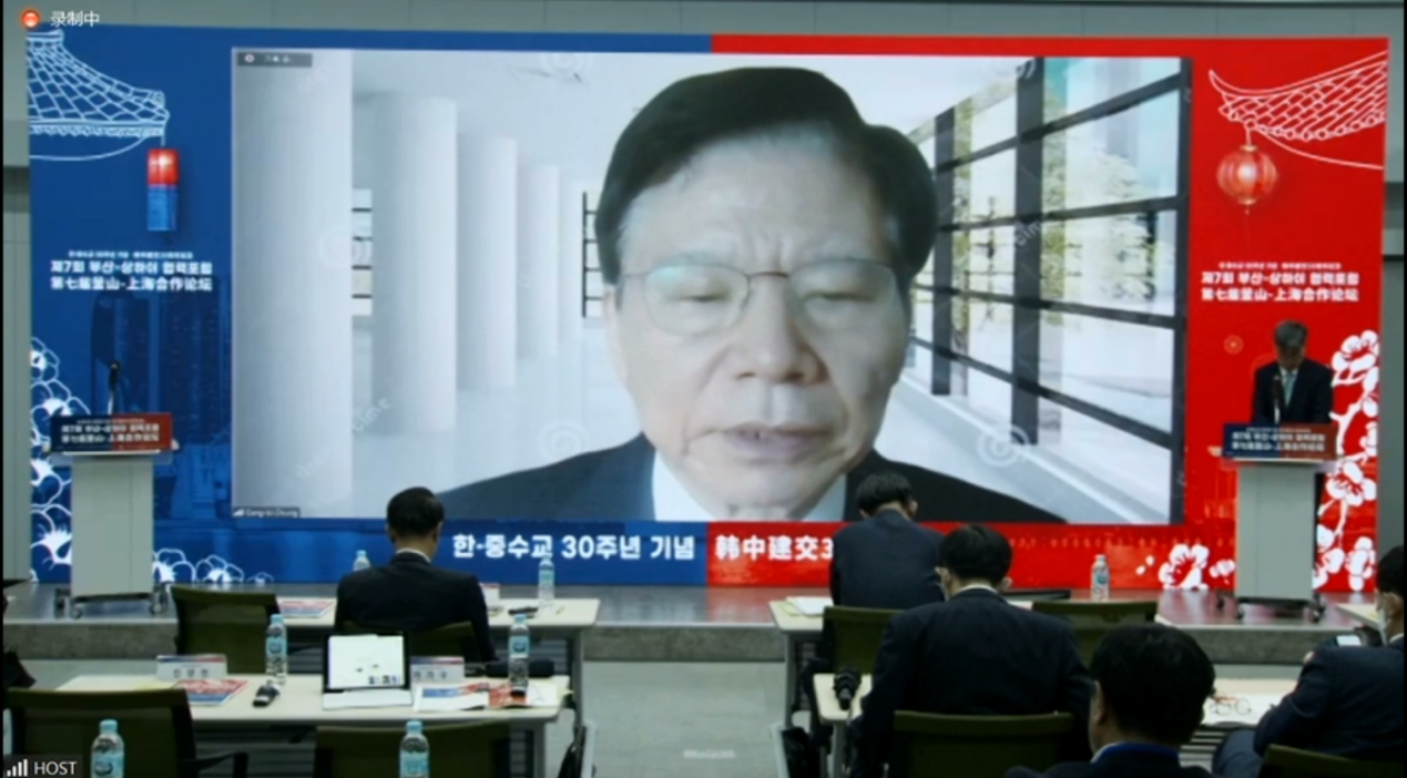 2022年9月2日,由同济大学中国战略研究院、韩国东西大学东亚研究院中国研究中心共同合作的第七届上海-釜山合作论坛暨中韩建交30周年纪念国际研讨会成功举办。本次论坛由韩国东西大学东亚研究院中国研究中心承办,由韩国釜山国际交流财团和上海市人民对外友好协会合作参与。来自同济大学、北京大学、复旦大学、吉林大学、中国社会科学院、上海社会科学院、上海师范大学等单位的20余位中国专家学者在线上参与论坛,同济大学党委副书记吴广明、中国前驻韩国大使/同济大学韩国研究中心名誉主任宁赋魁、中国前驻韩国大使邱国洪、上海市人民对外友好协会副会长景莹、中国驻釜山副总领事涂敬昌出席并致辞发言。同时,来自东西大学、国立外交院、国立釜山大学、国立仁川大学、韩国外国语大学、釜山经济振兴院、釜山研究院等机构的20余位韩国专家学者在线上展开交流,东西大学校长张济国、韩国前驻中国大使/东西大学东亚研究院院长辛正承、韩国前东北亚合作大使丁相基、韩国驻上海总领事金胜镐、釜山国际交流财团事务总长郑钟弼出席并致辞发言。
