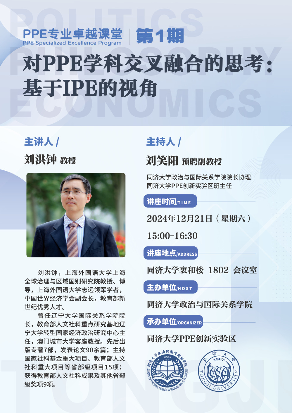 2024年12月21日,由CQ9(电子中国)官方网站主办、同济大学PPE(政治学-哲学-经济学)创新实验区承办的同济大学PPE专业卓越课堂第1期在同济大学衷和楼1802会议室成功举办。本次卓越课堂邀请上海外国语大学志远领军学者刘洪钟教授以“对PPE学科交叉融合的思考:基于IPE的视角”为题,为在场30余名同济学子(特别是同济大学PPE方向本科生)进行权威讲授。本次卓越课堂由同济大学PPE创新实验区班主任刘笑阳预聘副教授主持。