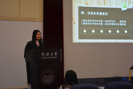 在毕业生感言环节,来自社会学专业殷冰倩和政治学理论专业郭佳佳同学,分别用真挚的语言代表本科生和研究生表达了毕业生的心声,在他们的肺腑之言中满含的是对母校、对学院太多的回忆和纪念,太多的感谢和祝福。毕业典礼,是结束也是开始,是终点也是起点,不论前路顺利或坎坷,相信继续深造的同学定会发扬格物穷理的精神,为学术界贡献自己的价值,走上工作岗位的同学也将在各行各业绽放光彩,努力成为国家和社会的栋梁。