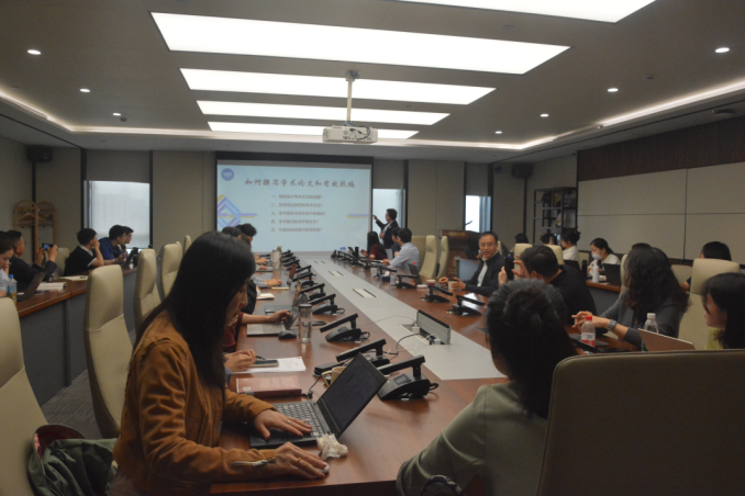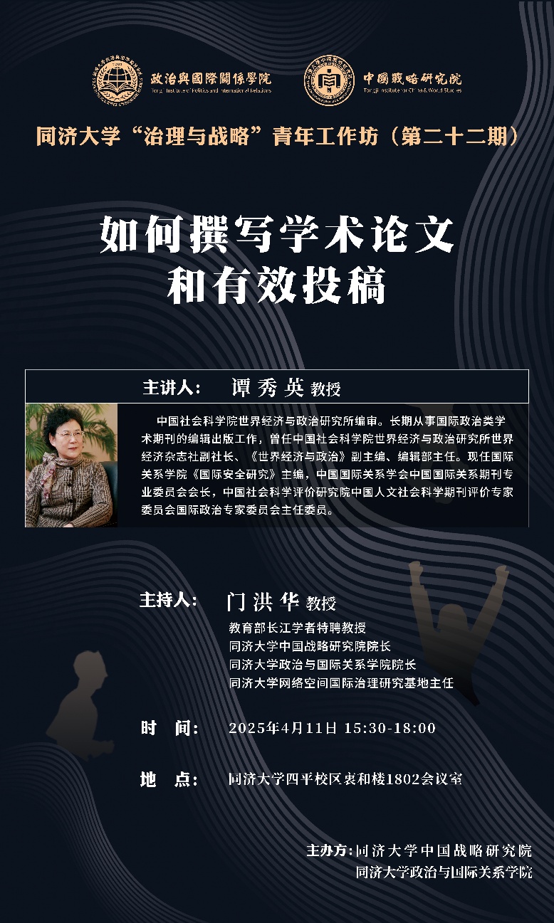 2025年4月11日下午,中国社会科学院世界经济与政治研究所编审、国际关系学院《国际安全研究》主编谭秀英研究员应邀在同济大学国政学院作题为"如何撰写学术论文和有效投稿"的专题讲座。该讲座由教育部长江学者特聘教授门洪华院长主持,共有同济大学教师、博士生、硕士生60余人参加。