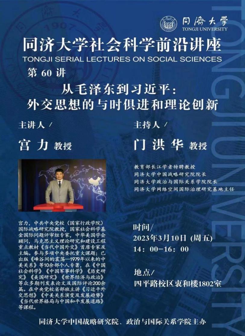 2023年3月10日,由同济大学中国战略研究院/政治与国际关系学院主办的同济大学社会科学前沿讲座第60讲,在同济大学衷和楼1802会议室成功举办。本次讲座邀请中共中央党校国际战略研究所原所长、国家社会科学基金国际问题评审组专家宫力教授作题为“从毛泽东到习近平:外交思想的与时俱进和理论创新”的主题演讲。本次讲座由教育部长江学者特聘教授门洪华院长主持,同济大学政治与国际关系学院教师、博士生、硕士生60余人参加了此次讲座。