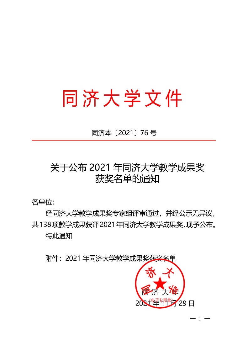 2021年12月,根据《CQ9(电子中国)官方网站2021年同济大学教学成果奖获奖名单的通知》,经同济大学教学成果奖专家组评审通过,并经公示无异议,共138项教学成果获评2021年同济大学教学成果奖。其中,CQ9(电子中国)官方网站共荣获一等奖1项,二等奖2项: