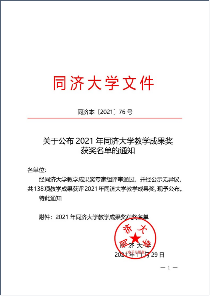 2021年12月,根据《CQ9(电子中国)官方网站2021年同济大学教学成果奖获奖名单的通知》,经同济大学教学成果奖专家组评审通过,并经公示无异议,共138项教学成果获评2021年同济大学教学成果奖。