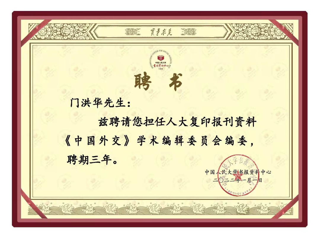 2022年1月1日,同济大学同济特聘教授、中国战略研究院院长、政治与国际关系学院院长门洪华教授被聘为人大复印报刊资料《中国外交》学术编辑委员会编委。此前,门洪华教授曾多次入选中国人民大学人文社会科学学术成果评价中心和中国人民大学报刊资料中心联合研制的《复印报刊资料重要转载来源作者》的政治学重要学者。