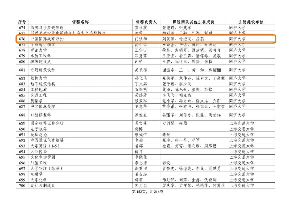 其中,教育部长江学者特聘教授、同济大学中国战略研究院/政治与国际关系学院院长门洪华教授主讲的《中国国际战略导论》入选第二批国家级一流本科课程(线下课程)。这是继《中国国际战略导论》2021年入选“上海高等学校一流本科课程”之后,本课程再次取得的重大建设成果,同时也是同济大学政治学学科今年来推动教学改革和金课建设的标志性进展。