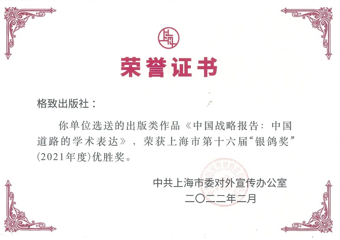 2022年2月,由中共上海市委对外宣传办公室组织开展的上海市第十六届“银鸽奖”(2021年度)评选活动结果揭晓,由格致出版社选送,同济大学门洪华教授、中国社会科学杂志社李放编审、吉林大学肖晞教授联合主编的《中国战略报告(第三辑):中国道路的学术表达》(格致出版社·上海人民出版社2016年版)荣获上海市“银鸽奖”(2021年度)优胜奖。