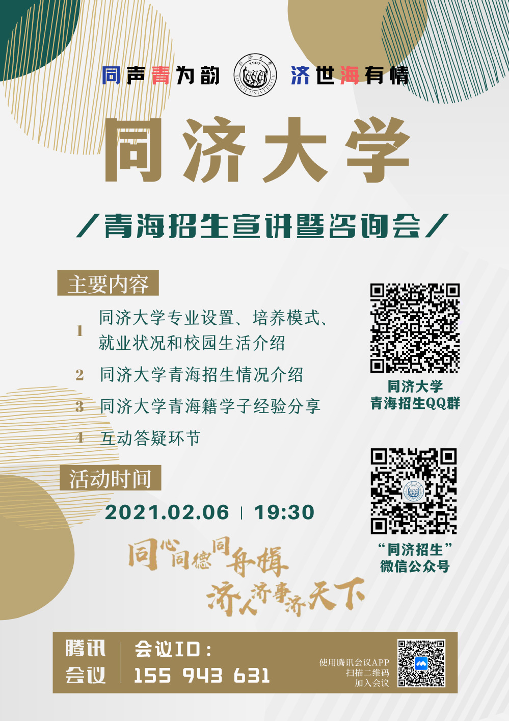与此同时,同济大学青海招生组还特别安排了两位2020年新近考入同济大学的青海籍学生在线为青海考生和家长做情况介绍和经验分享。其中,来自同济大学2020级工科试验班(建筑规划景观与设计类)的薛瑶嘉同学结合在校园的切实感受,既为大家呈现出了稳步前行而又生机勃勃的同济学子生活,也通过自身的高考经验勉励青海学子安心备考,并且期待未来在同济大学的美丽校园相见。随后,来自2020级工科试验班(土木与环境类)的曹生喆同学则在招生组的宣讲内容基础上补充说明了同济大学的优势特色,并就自身学习的体验与收获分享了同济大学对莘莘学子的关怀与培养,相信青海学子一定可以在同济大学的校园中收获到更好的自己。
