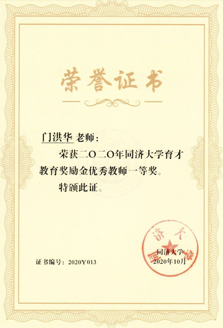 2020年10月,由同济大学本科生院组织、各学院遴选推荐、校奖教金评审委员会审议,评选出2020年度同济大学育才教育奖励金特等奖5名,一等奖10名,二等奖45名。在此次评选中,同济大学同济特聘教授、中国战略研究院院长、政治与国际关系学院院长、中央网信办-教育部网络空间国际战略研究同济大学基地主任门洪华教授荣获2020年度同济大学育才教育奖励金一等奖。