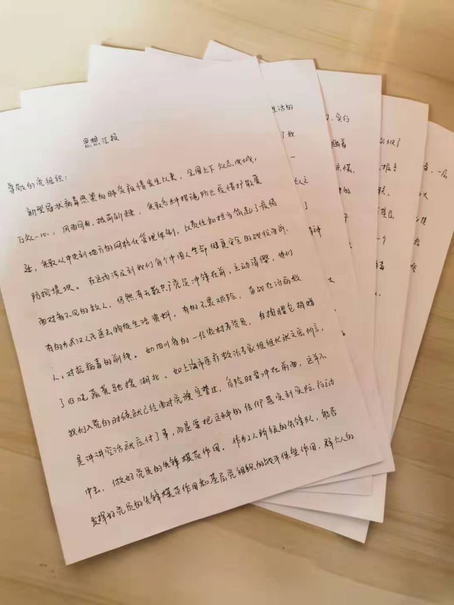 我院各党支部充分发挥党组织的战斗堡垒作用,线上宣传疫情防治知识和防控要求,进一步强化党员的责任与担当。面对此次疫情,入党积极分子向党组织提交特殊的思想汇报,坚定信念,为抗击疫情加油。