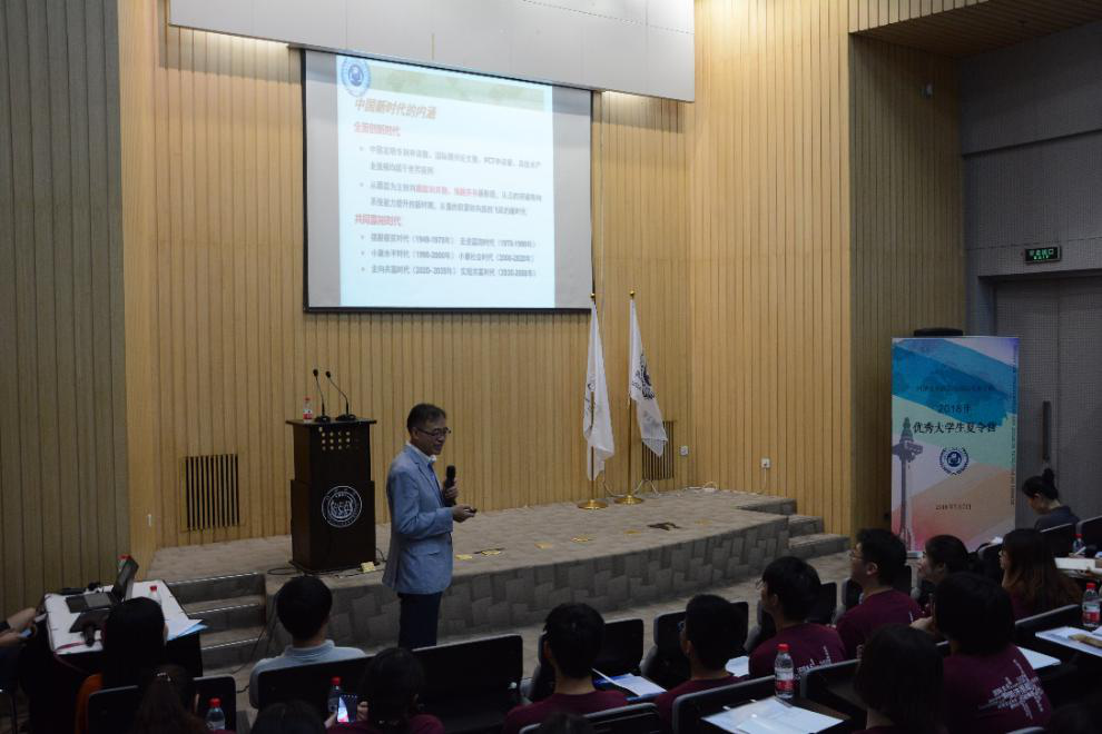 7月7日8:30,“2018年全国优秀大学生夏令营” 在衷和楼4楼报告厅拉开帷幕。政治与国际关系学院院长门洪华教授、政治与国际关系学院副院长王存刚教授、院长助理孙明副教授、政治学系副主任赵萍丽副教授、学生工作办公室主任陈竞老师出席。王存刚副院长主持夏令营开营仪式。