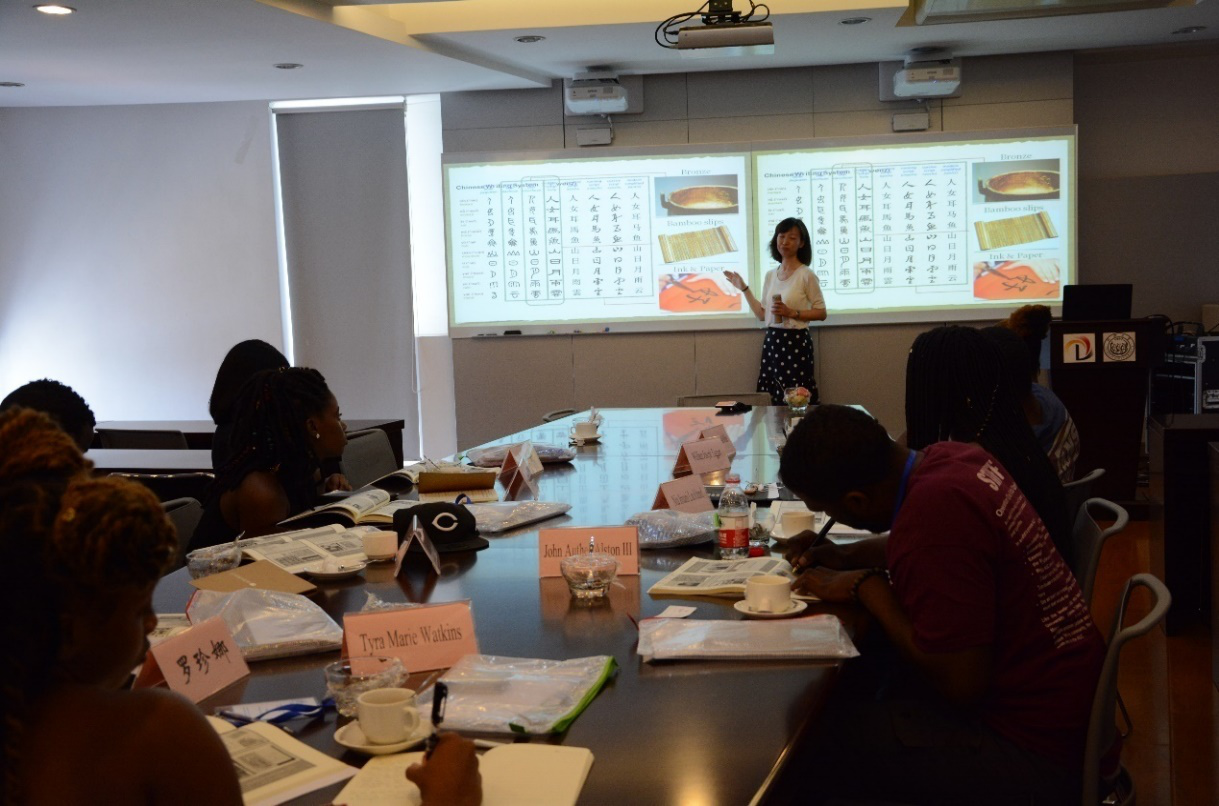 潘玮琳老师在专题讲座中用精彩丰富的图片向美国大学生介绍了中国的文学传统。首先,她介绍了中国的语言和古文字,并解释了“中国”这个称呼的历史来源和含义。中国的文字随着历史的变化和时间的迁移发展至今,象形文字生动形象,隶书草书变化多端。讲到毛笔字,潘老师还拿出毛笔现场传看,美国大学生们十分感兴趣。接下来,潘老师介绍了中国的思想和文学经典《诗经》,并现场请同学用英文朗读了著名篇章《关雎》和《硕鼠》。最后,潘老师讲述了中国的文化和历史故事。中国历史与文化源远流长,司马迁的《史记》、唐宋时期李白和杜甫的诗词、明清时期的四大名著以及戏剧都是中国的文化瑰宝。美国大学生沉浸于这场中国文化所带来的视听盛宴,积极与潘老师互动,对中国文学传统有了更进一步的了解,达到了非常好的课堂效果。