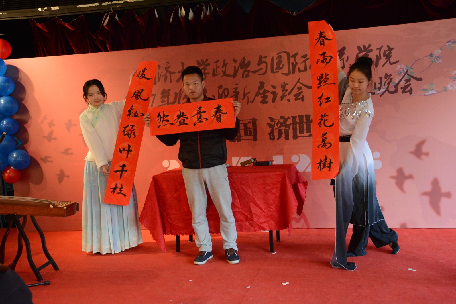 座谈会以蒙万继、范晓筠和孔苓丽同学联袂带来的表演《行云流水》作为开场。弦音悠悠,似环佩玲响;衣袂飘飘,若轻云蔽月。一曲作罢,蒙万继现场书法带来对联“春雨点红花万树,暖风妆绿叶千枝”,一派春意盎然。