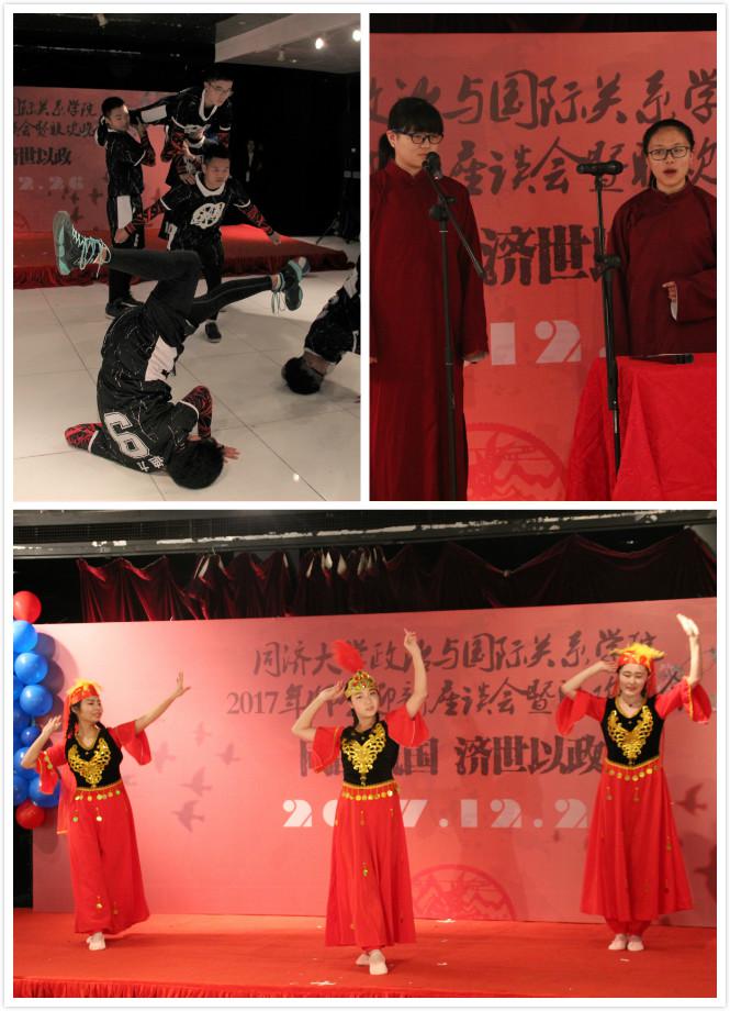 在政逢国梦板块,各种形式的节目将晚会带向高潮。由孙明老师、葛天任老师、刘骞老师和刘子涵、何俊萍、李思熠同学带来歌曲串烧《济政师生颂》,将情深深意绵绵的师生情流淌在每个观众心里。诗歌朗诵《盛世中国》,民乐、西洋乐对弹《大鱼》和宅舞《孑然妒火》使晚会现场氛围愈加的热烈,掌声频频,喝彩不断。