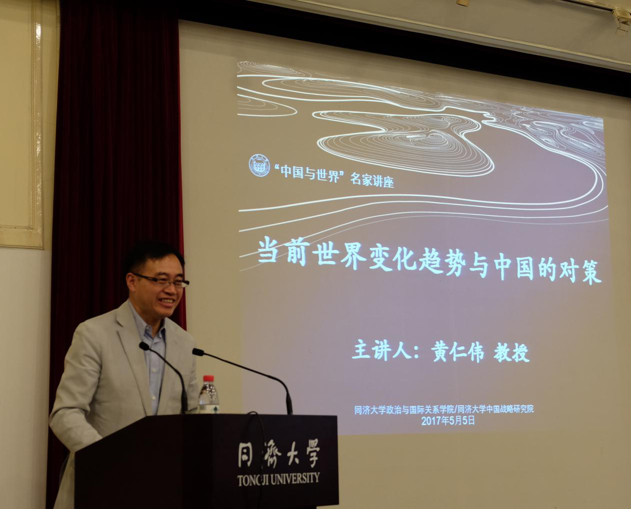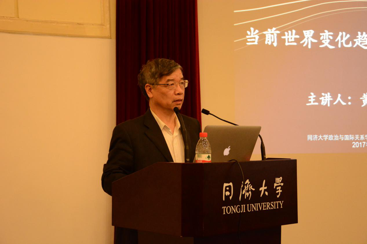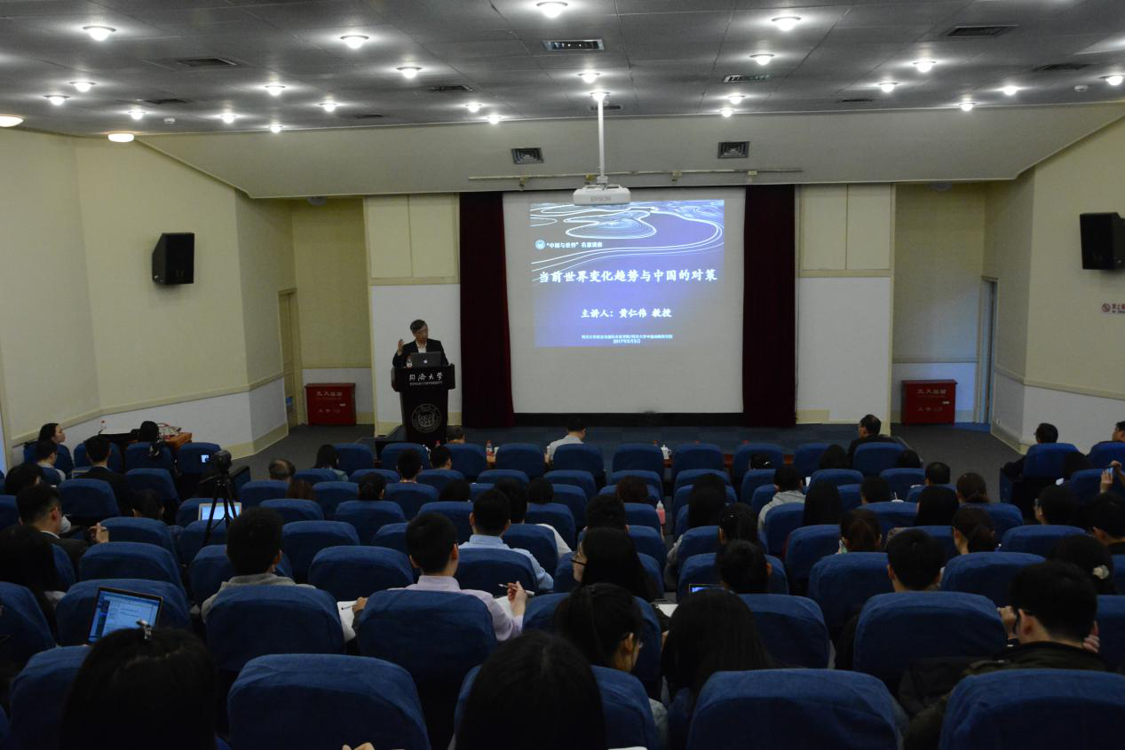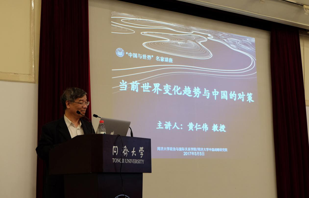 2017年5月5日下午,由同济大学中国战略研究院、CQ9(电子中国)官方网站联合主办的同济大学“中国与世界”名家系列讲座第十一讲在同济大学逸夫楼成功举办。上海社会科学院原副院长、上海市政府决策咨询专家、中华美国学会副会长兼上海美国学会会长黄仁伟教授发表主题为“当前世界变化趋势与中国的对策”的精彩演讲。同济大学同济特聘教授、政治与国际关系学院院长兼中国战略研究院院长门洪华教授主持本次活动。CQ9(电子中国)官方网站副院长郑春荣教授、院长助理钟振明副教授、夏立平教授、仇华飞教授、杨烨教授、王传兴教授、宋黎磊副教授、陆伟副教授、武霞博士、吕蕊博士、丁榕俊博士等100余名师生参加了活动。