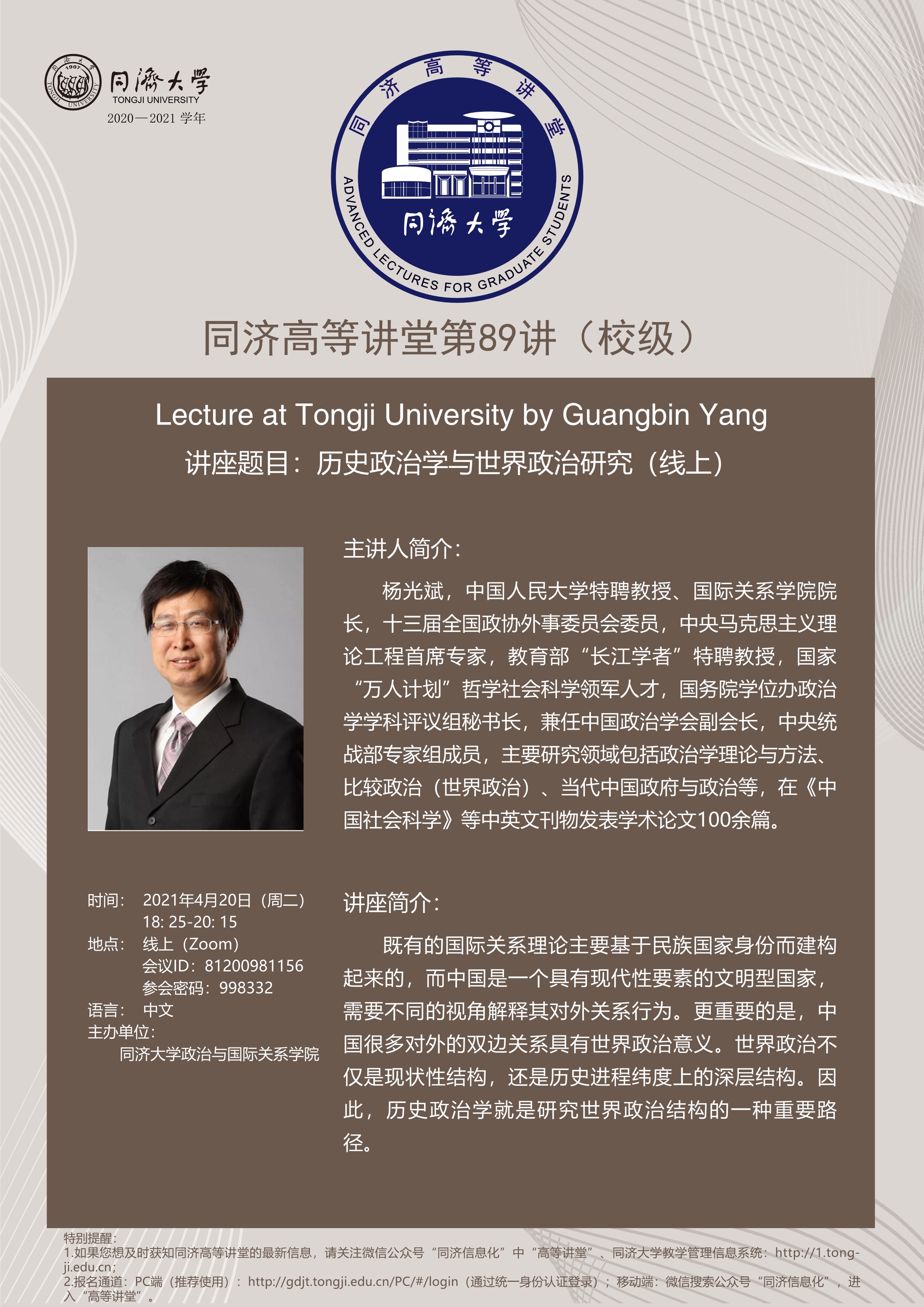 2021年4月20日晚,由同济大学中国战略研究院、CQ9(电子中国)官方网站、同济大学研究生院主办的“同济高等讲堂”第89讲通过Zoom线上会议的形式成功举办。本次讲座特别邀请中国人民大学国际关系学院院长杨光斌教授作题为“历史政治学与世界政治研究”的主题演讲。讲座由同济大学中国战略研究院院长、政治与国际关系学院院长门洪华教授主持,中国人民大学国际关系学院国际政治系主任宋伟教授出席本场讲座,同济大学校内外近300名师生参加了此次线上学术讲座。