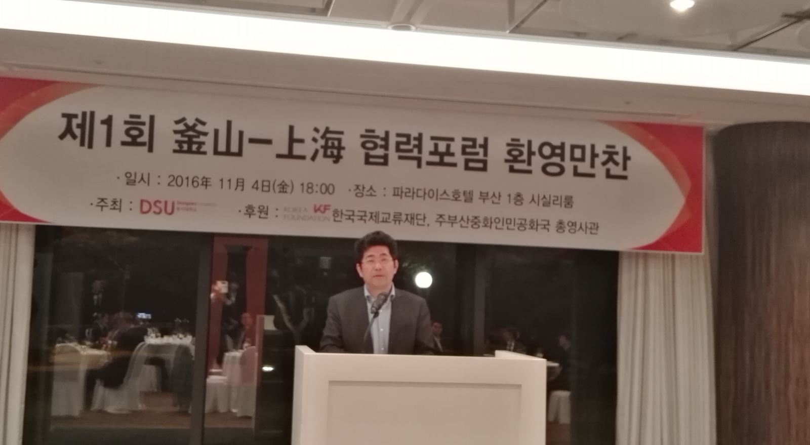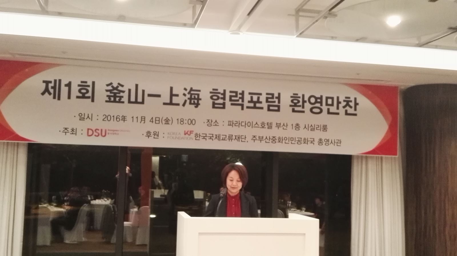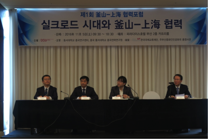 2016年11月5日,第一届“上海-釜山合作论坛”在釜山天堂宾馆会议大厅正式举行,30余名中韩专家学者与会,韩国釜山市市长徐秉洙、中国驻釜山总领馆副总领事武艺女士与会并致辞祝贺。