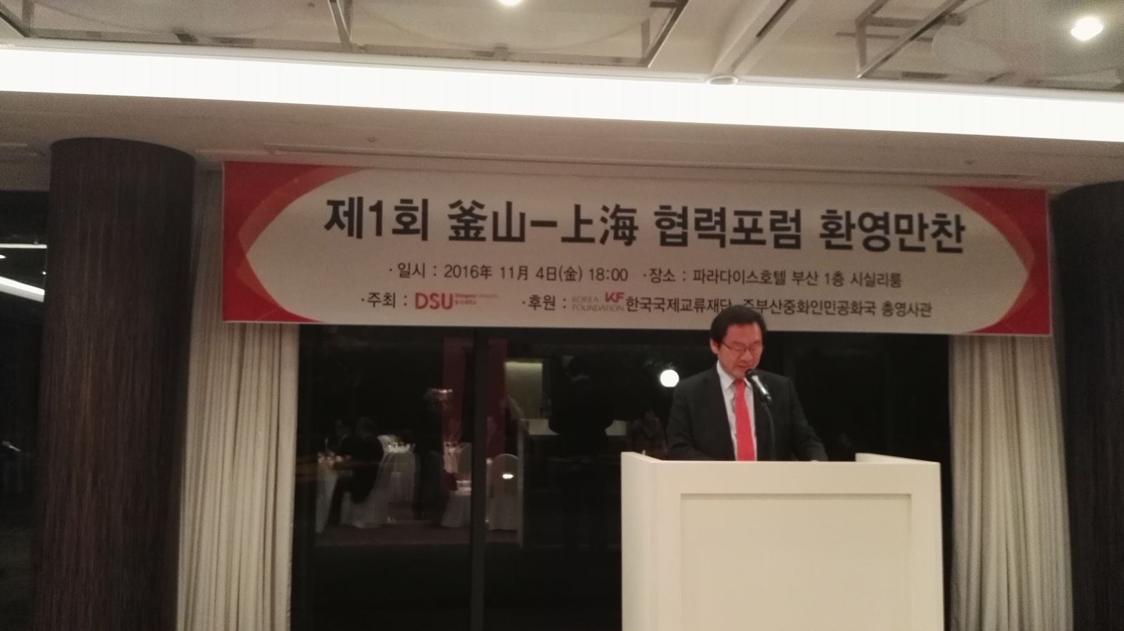 第一届“上海-釜山合作论坛”会议的举办地为韩国釜山天堂酒店。11月4日,东西大学为同济大学代表团举行欢迎会,东西大学校长张济国、同济大学副校长吕培明、中国驻釜山副总领事武艺等先后致辞,祝贺第一届“上海-釜山合作论坛”的顺利举办。