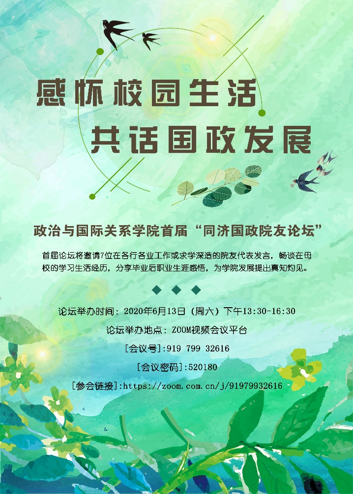 2020年6月13日下午,以“感怀校园生活,共话国政发展”为主题的首届同济国政院友论坛通过ZOOM视频会议平台隆重举行。校党委副书记、纪委书记方平教授参加论坛并致辞,政治与国际关系学院院友和教师、学生代表80余人参加本次论坛,论坛由国政学院党委书记徐红教授主持。