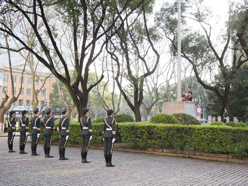 伴随着主持人蒋蕴宣布升旗仪式正式开始,激昂雄壮的国歌奏响,在全体师生的注目礼下,同济大学国旗护卫队的队员们昂首挺胸,迈着庄严而整齐的步伐,将五星红旗缓缓升向同济校园的天空之中。在嘹亮的国歌声中,五星红旗迎风飘扬,象征着同济学子积极进取、不懈奋斗的决心。