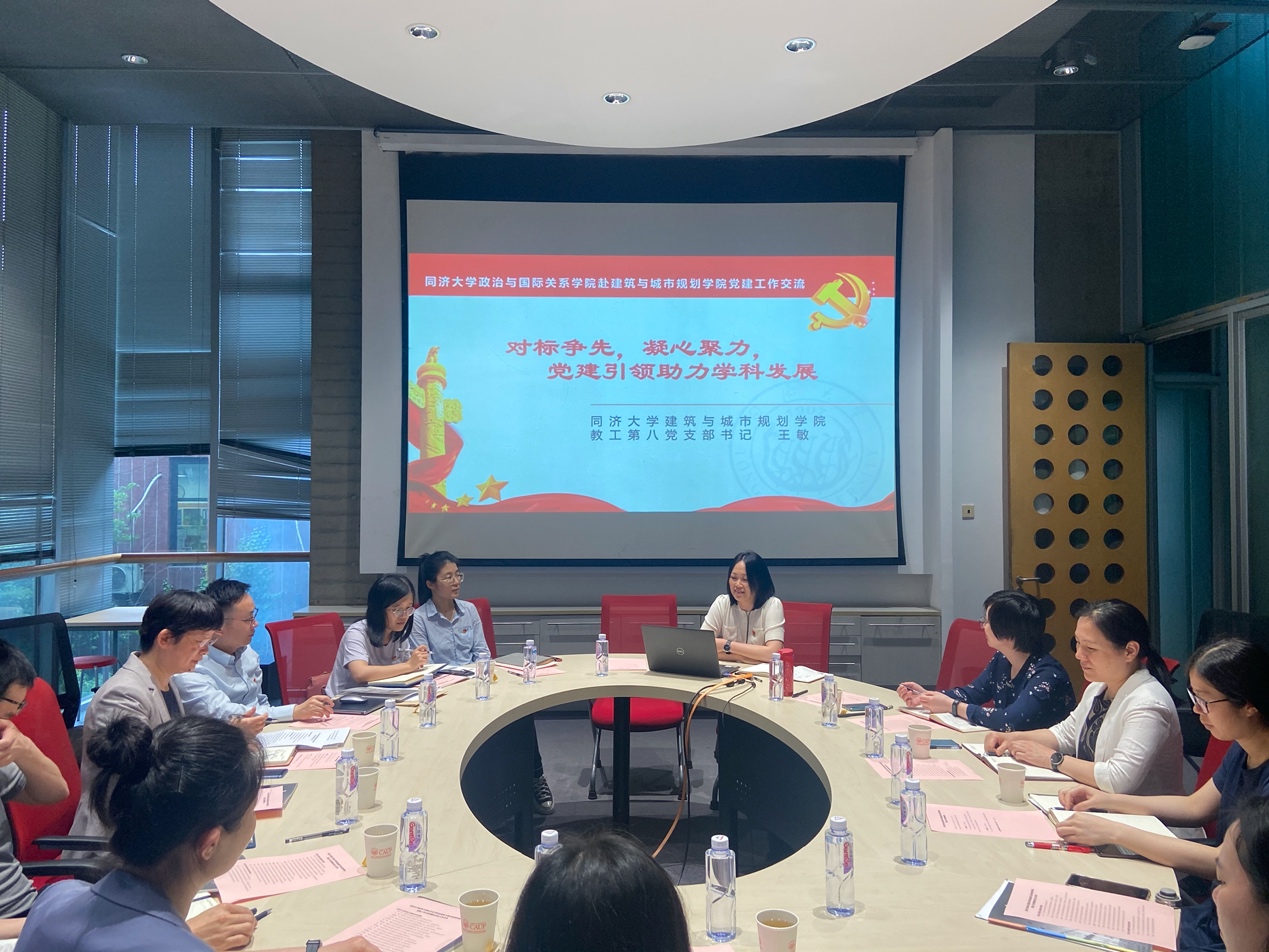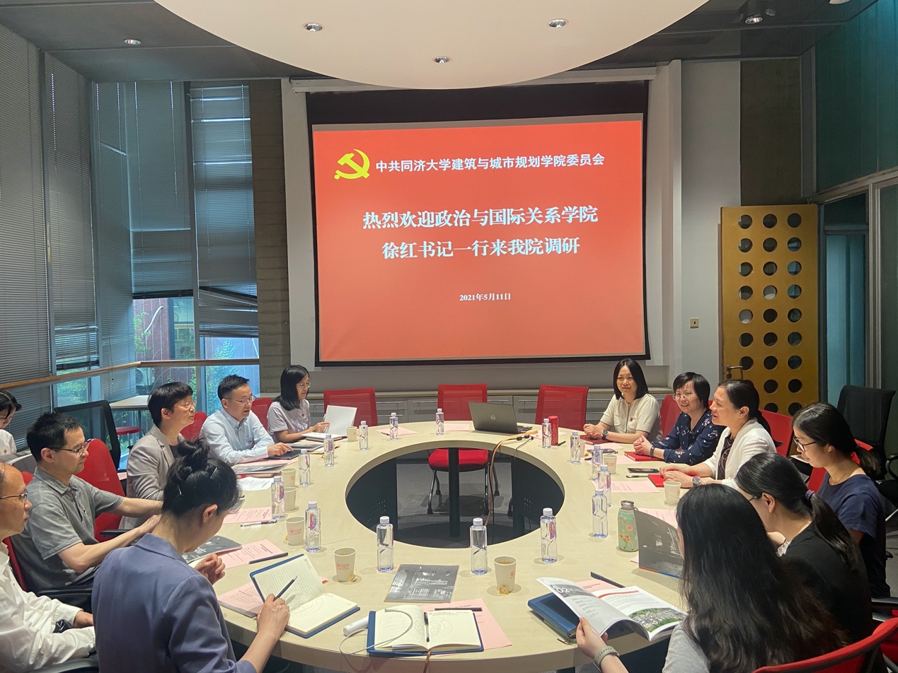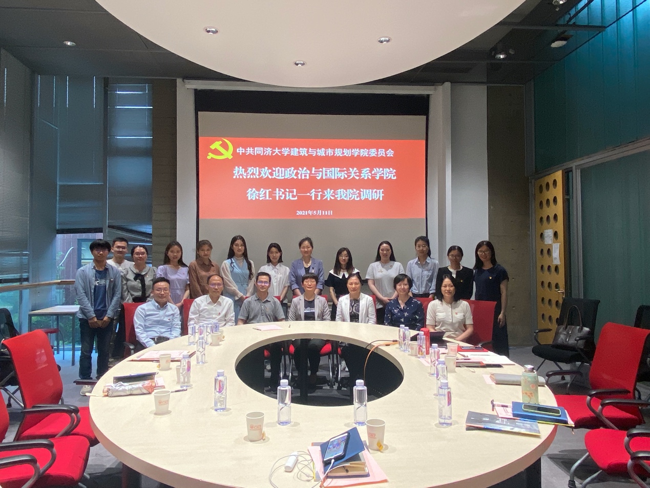 2021年5月11日下午,为学习同济大学兄弟院校党建工作先进经验,推进学院党建工作进一步发展,政治与国际关系学院党委书记徐红率领学院全体基层党支部书记和部分支委赴建筑与城市规划学院开展党建调研。城规学院党委书记刘颂、党委副书记唐育虹、教工第八党支部书记王敏等对我院师生表示热烈欢迎,双方在建筑与城市规划学院C1会议室召开党建经验交流座谈会,就学院党建工作情况、全国党建标杆党支部的先进经验、“三全育人”机制等主题开展了广泛的交流和讨论。学院党委书记徐红、党委副书记宋波、教工第一党支部书记钟振明、教工第二党支部书记赵萍丽、教工第三党支部书记郑春荣、本科生党支部书记岑昱玮、院党委组织员宫振蒙及四位研究生党支部书记等十余人参加了本次交流活动。此次调研共包括三个部分:听取城规学院全国标杆党支部经验介绍、双方交流座谈和参观城规学院党员之家和双带头人工作室。