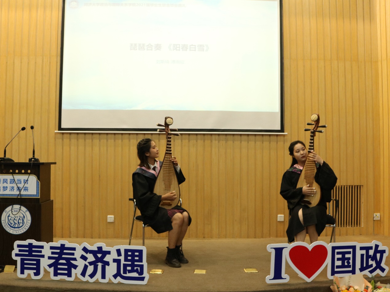 典礼过程中,毕业生们还带来了精彩的节目表演。刘斯琦、溥雨欣带来了一曲优美动人的琵琶合奏《阳春白雪》,姜波、吴函霏、娜迪娅·海沙尔、胡翱洋、韩奇、岳晴六位同学饱含深情献上了由张惠嘉创作的诗朗诵《十年树木 百年树人》,表达着对学院、对老师深深的感激与祝福。