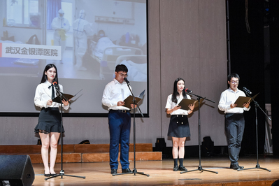 The ceremony was also accompanied by wonderful performances. Ou Huaxuan, Feng Junpeng and Zhu Shuyang presented a beautiful ensemble of musical instruments, “Rosy Clouds Chasing the Moon”, featuring a harmony of piano, guqin and Chinese zither in a comfortable rhythm, offeringthe audience a seemingly immersive vision of the wide and boundless landscape. Next performance was a recitation of the poem 'Follow the Light to the Future'. Through the performers’ sonorous words and determined look,we can feel their wish and yearning for the future. They are committed to contributing to the society with what they have learnt from the School. The chorus 'Looking up to the Starry Sky' by the teachers and students reflected their dreams for an idealistic future and aspiration for their own starry sky with a down-to-earth attitude. The last play was the recitation of an original poem “Fighting against COVID-19 Together”. Just as the poem said at the end, “Fearless to any hardship or suffering, we are always full of confidence and strength; with our blood hot as fire and our heart filled with enthusiasm, we will eventually become the backbone of the nation', the students have developed a more attic faith and steadfast sense of responsibility amid the pandemic.