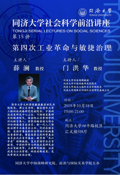 On October 18, 2019, the Tongji Serial Lectures on Social Sciences No.18, hosted by the Institute for China & World Studies and the School of Political Science & International Relations (SPSIR) of Tongji University, was successfully held in Conference Hall 518, Huiwen Building, Tongji University. Dr. Xue Lan, a senior professor of liberal arts (1st batch) at Tsinghua University, a Changjiang Scholar of Public Administration in China, and Dean of Schwarzman College at Tsinghua University, was specially invited to give a keynote speech on the topic of 'The Fourth Industrial Revolution and Agile Governance' for teachers and students of Tongji.